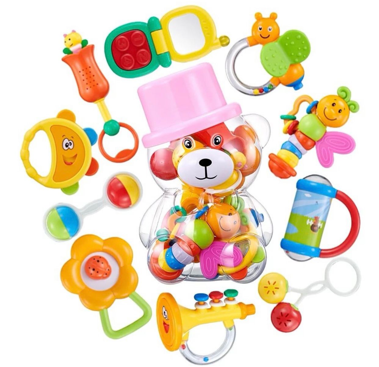 A 10-piece set of baby shakers, which are also described as rattles and teethers for infants.