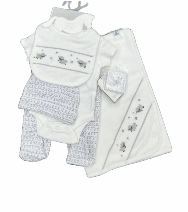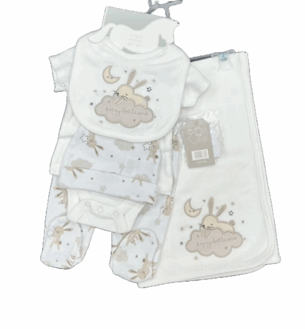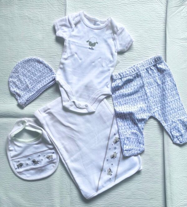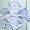 The set includes a bodysuit, a pair of pants, a bib, a hat, and a receiver (a type of blanket or swaddle).